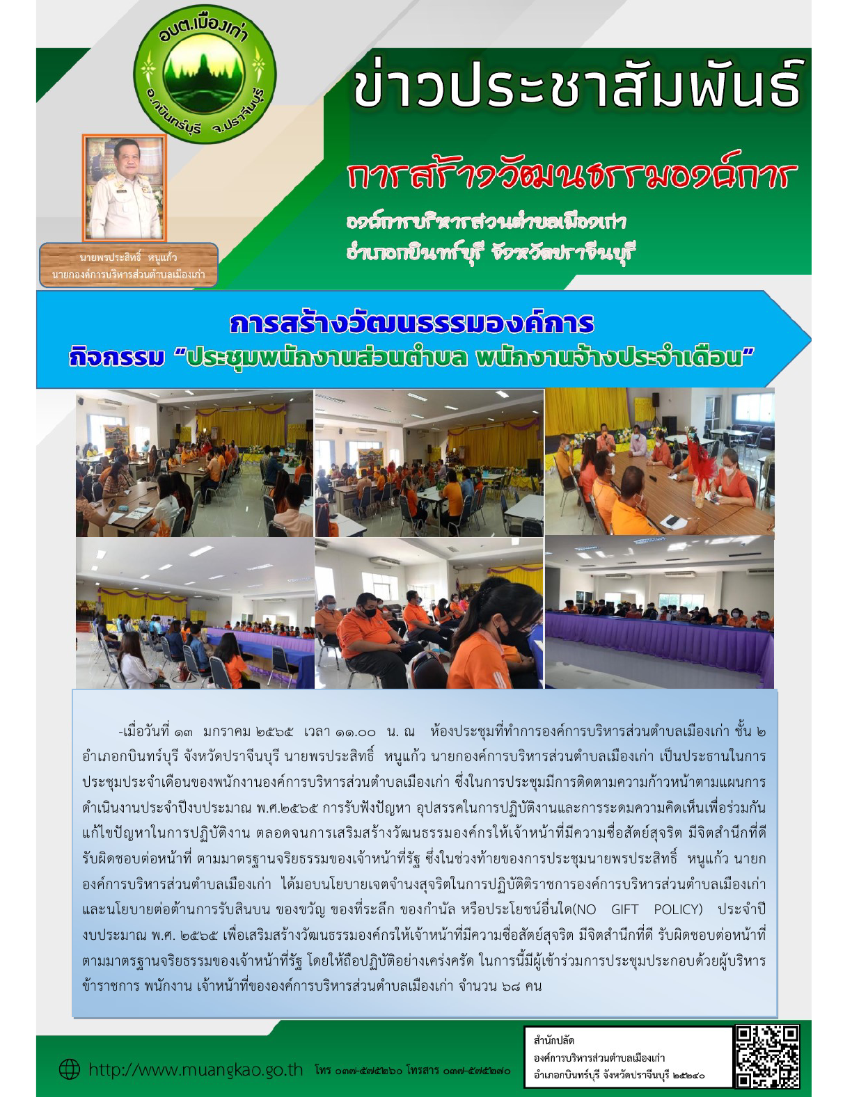 ประกาศองค์การบริหารส่วนตำบลเมืองเก่า เรื่อง โครงสร้างและการจัดองค์กรในการดำเนินงาน สรุป อำนาจหน้าที่ที่สำคัญและวิธีการดำเนินงาน สถานที่ติดต่อเพื่อขอรับข้อมูลข่าวสาร |